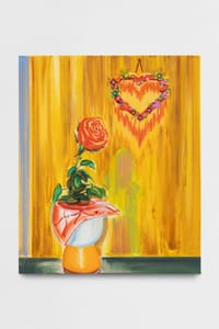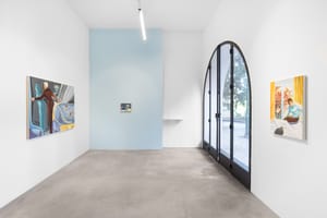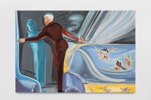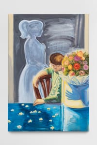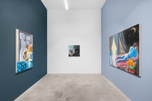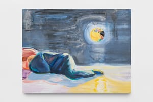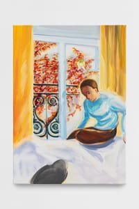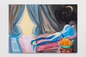 In this new body of work by Qianyu Li, the domestic settings in which the scenes depicted unfold seem to open up onto other dimensions. Windows—long a metaphor in painting—open onto the outside world, but that's not all: here, the exterior and interior interpenetrate and merge. Sometimes it seems as if the back wall itself is disappearing, with curtains like real stage wings opening onto a night sky, a mysterious backdrop onto which shadows with the sharp outlines of statues are projected, or a crescent moon appears in the darkest corner of the room.