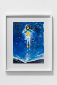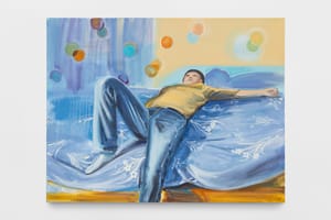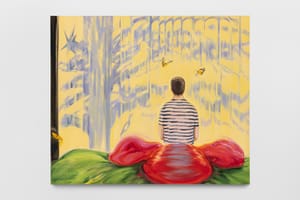 Neste novo conjunto de obras de Qianyu Li, os cenários domésticos em que as cenas retratadas se desenrolam parecem abrir-se para outras dimensões. As janelas — há muito uma metáfora na pintura — abrem-se para o mundo exterior, mas não é só isso: aqui, o exterior e o interior interpenetram-se e fundem-se. Às vezes, parece que a própria parede do fundo está a desaparecer, com cortinas como verdadeiras alas de palco a abrir-se para um céu noturno, um cenário misterioso no qual sombras com contornos nítidos de estátuas são projetadas, ou uma lua crescente aparece no canto mais escuro da sala.