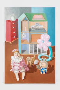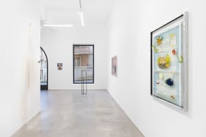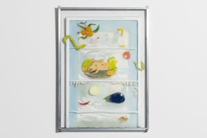 Sofia Mascate’s paintings develop a fabulous imagery, vaporous in its light and diluted colors, and at the same time carry on a dialogue with the genre of still life. The formal setting of some paintings recalls the compositional solutions of some prominent American still-life late 19th century painters—such as John F. Peto, and John Haberle—who, although known for their realistic, almost trompe-l’oeil style, paved the way for experimentation with assemblage and display cases, thanks to their juxtaposition of disparate objects painted on a vertical plane. While the realistic side is completely abandoned in Mascate’s painting, the surreal aspect survives, emphasized by the subjects and the arrangement of objects on the glass.